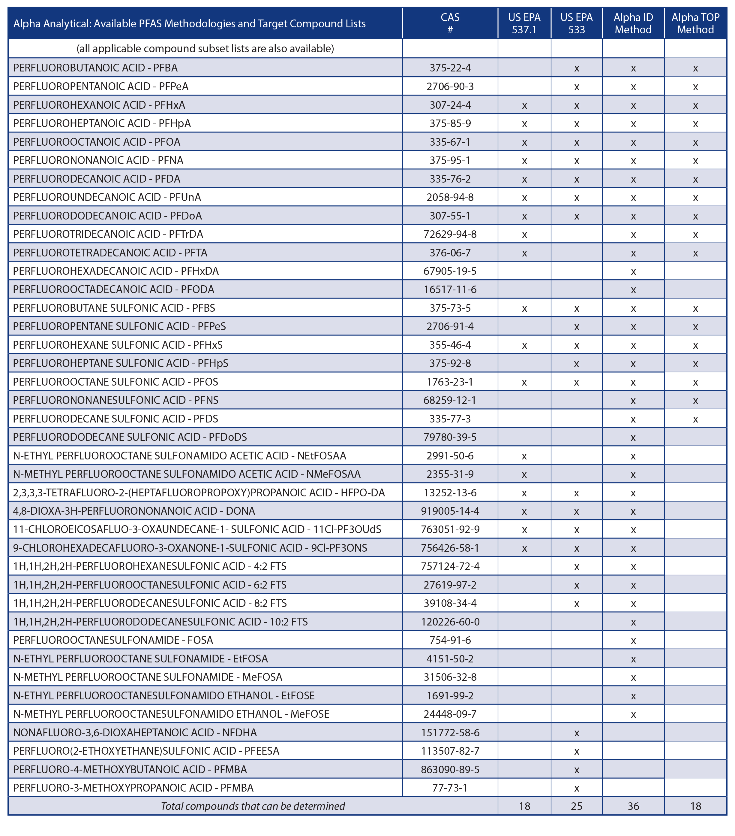 Please see the table below that lists the two EPA drinking water target compounds as well as the Alpha proprietary isotope dilution and Total Oxidizable Precursors (TOP) PFAS target compound lists.